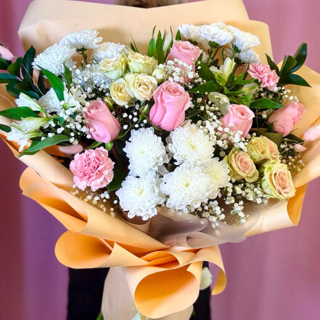 Состав: хризантема кустовая, альстромерия, эустома, гипсофила, зелень.